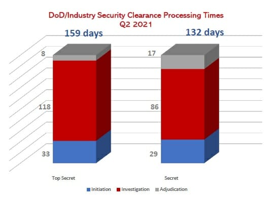Department of Defense Industry security clearance processing times saw a slight up-tick in the second quarter of FY 2021, according to updates given by the Defense Counterintelligence and Security Agency at today's National Industrial Security Program Policy Advisory Committee (NISPPAC) meeting. Current Top Secret clearance processing times are 159 days, and Secret clearance processing times are 132 days. These numbers only represent industry applicants – processing times are slightly faster for all DCSA cases, which included DoD civilians and service members.
