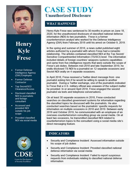 Frese, 32, was a counterterrorism analyst at the DIA from 2017 until last October. He admitted in February to sharing national defense information with a consultant and two reporters, one of whom he was dating.