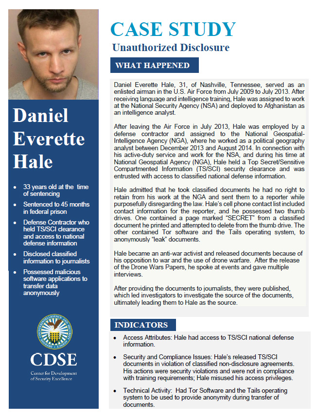 According to court documents, Daniel Everette Hale, 33, of Nashville, began communicating with a reporter beginning in April 2013 while enlisted in the U.S. Air Force and assigned to the National Security Agency (NSA). Hale admitted to meeting with the reporter in person on multiple occasions and communicating with the reporter via phone, text message, email and, at times, an encrypted messaging platform.