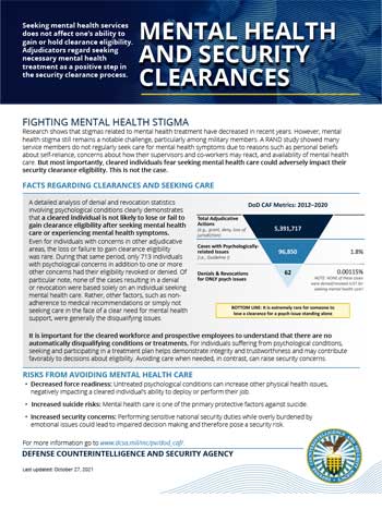 Review the CDSE Mental Health and Security Clearances Fact Sheet with FAQ's covering Security, Clearances and Reporting.