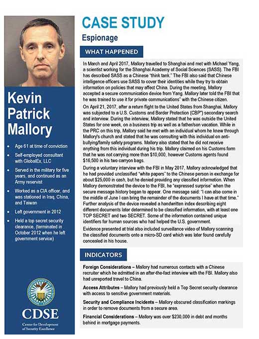 In March and April 2017, Mallory travelled to Shanghai and met with Michael Yang, a scientist working for the Shanghai Academy of Social Sciences (SASS). The FBI has described SASS as a Chinese "think tank." The FBI also said that Chinese intelligence officers use SASS to cover their identities while they try to obtain information on policies that may affect China. During the meeting, Mallory accepted a secure communication device from Yang. Mallory later told the FBI that he was trained to use it for private communications" with the Chinese citizen.