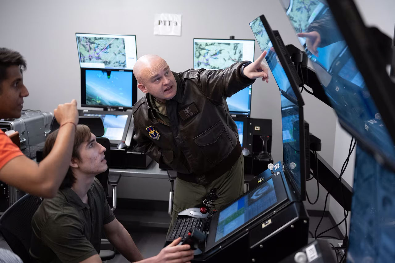 Photo By:Air National Guard Staff Sgt. Joseph Pagan. A pilot instructs students from the University of California, San Diego in an MQ-9 simulator at March Air Reserve Base, Calif., Feb 17, 2023. The National Guard Bureau facilitated a collaboration between the institution and members of the 163d Attack Wing in an effort to incorporate Artificial Intelligence to improve MQ-9 technology and provide a centralized location where real-time video and data can be shared instantaneously across organizations. Named Project