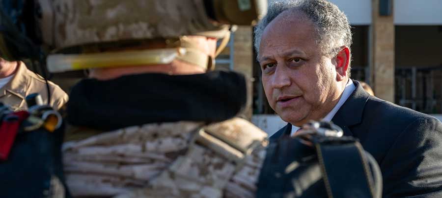 Secretary of the Navy Carlos Del Toro speaks to Sailors assigned to Naval Special Warfare (NSW) units in the San Diego area Nov. 8, 2021. (U.S. Navy photo by Mass Communication Specialist 2nd Class T. Logan Keown/Released)